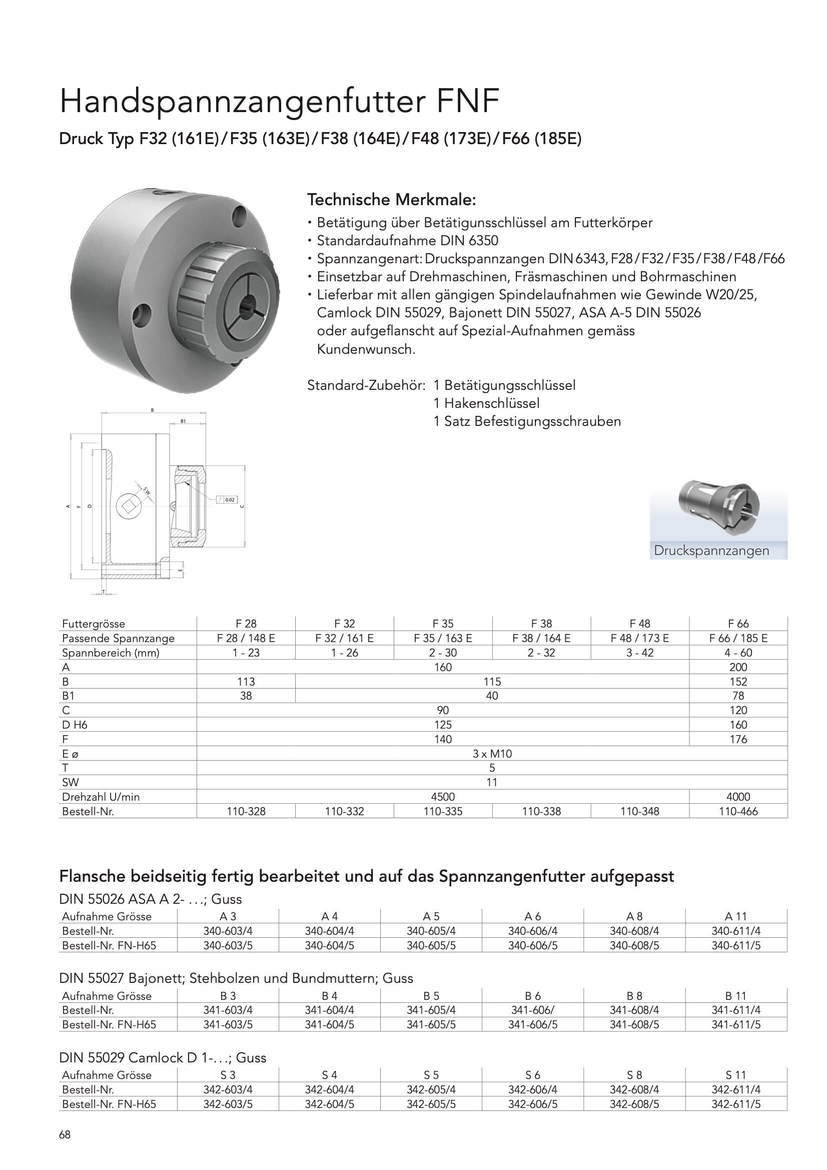 Handspannzangenfutter FNF für Druckspannzangen DIN6343, Typ F32 (161E)/F35 (163E)/F38 (164E)/F48 (173E)/F66 (185E)