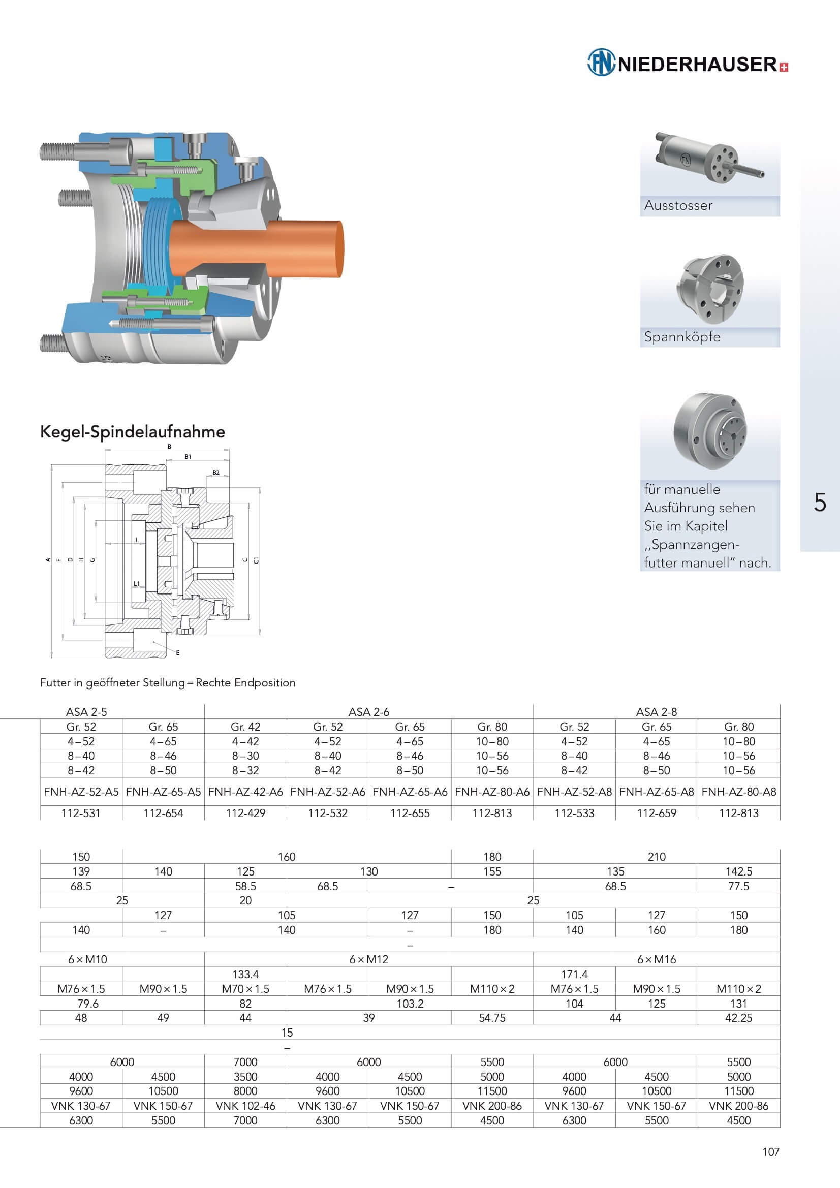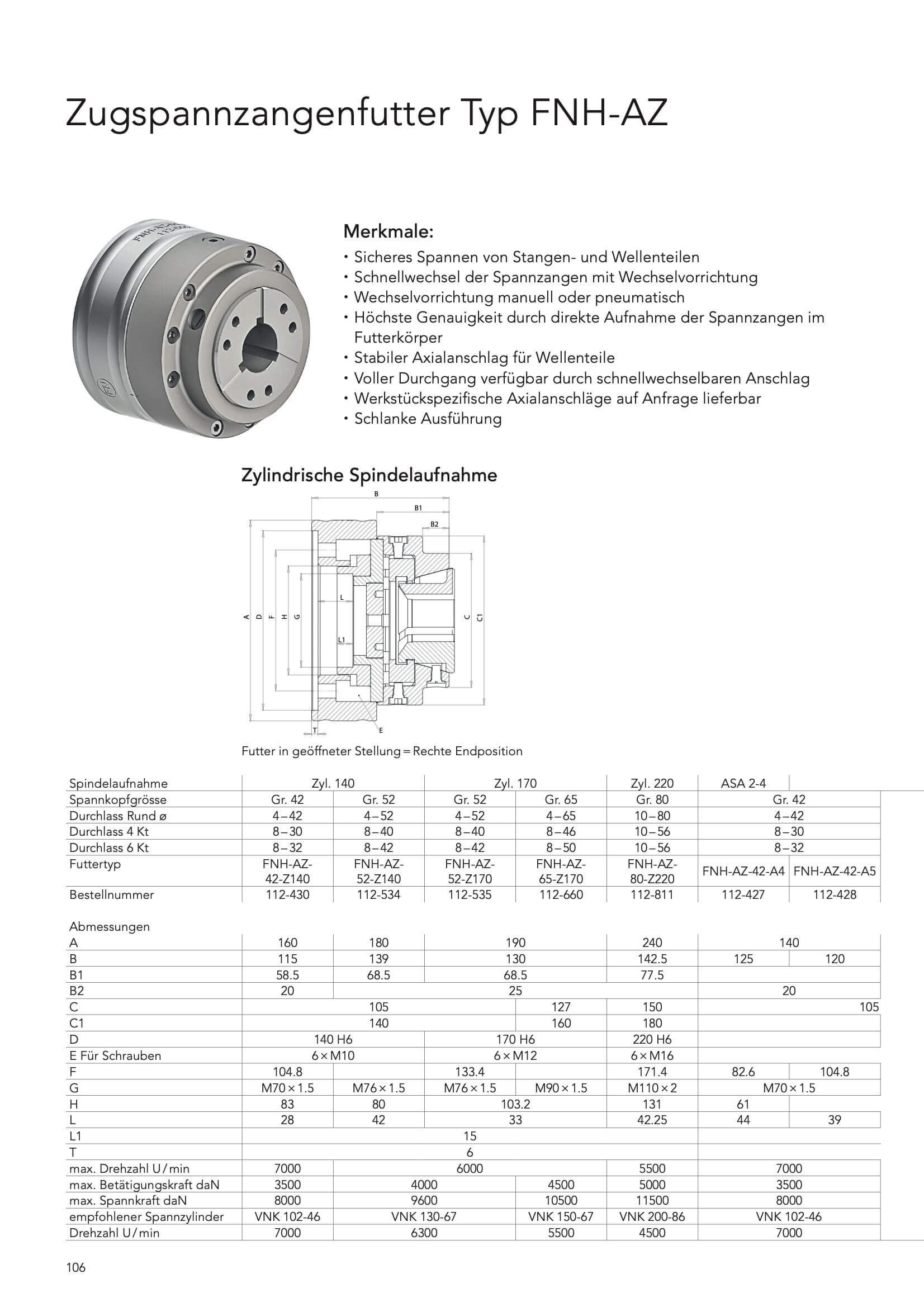 Zugspannzangenfutter Typ FNH-AZ Zyl. 140, 170, 220 und ASA 2-4, 2-5, 2-6, 2-8 für Spannkopfgröße Gr.42, 52, 65 und 80 weitere Grössen und Abmessungen auf Anfrage